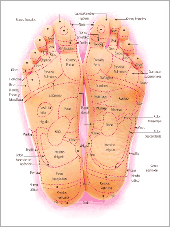 Cada zona de los pies es el reflejo de un órgano del cuerpo, de ahí que mediante el masaje de zonas concretas de los pies se puede influir reflejamente sobre los correspondientes órganos internos.
